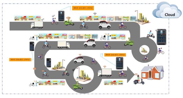| ▲ Vehicle에서 버려지는 잉여전력을 모아 배터리팩으로 저장하여 스왑하여 사용하는 그림 예시도 |
