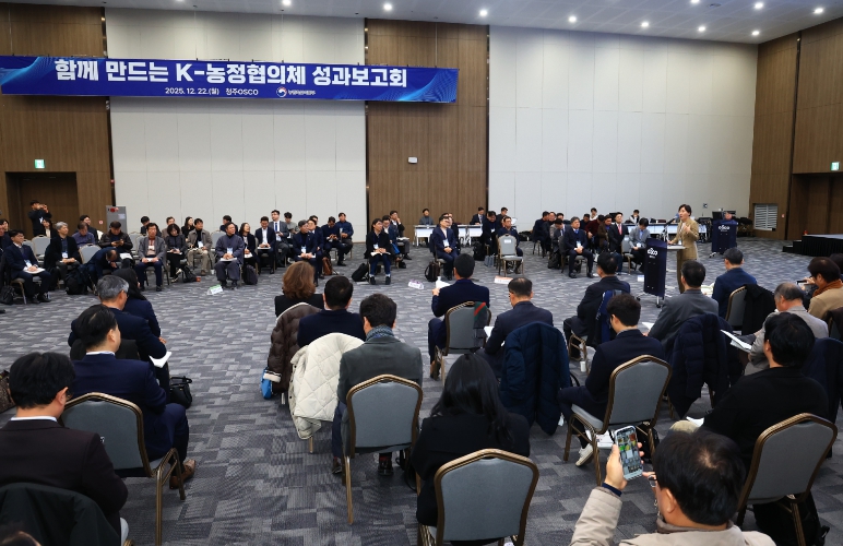 [뉴스앤톡] 농림축산식품부는 12월 22일 오후 청주오스코(OSCO)에서 '함께 만드는 K-농정협의체' 성과보고회를 개최했다. 이번 행사에는 K-농정협의체 공동대표인 송미령 농식품부 장관과 류진호 한국4-H청년농업인연합회 회장을 비롯한 협의체 위원 120여 명과 농어업농어촌특별위원회 김호 위원장을 포함한 관계자 30여 명 등 총 150여 명이 참석했다.
