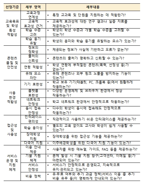 선택기준은 교육목표 적합성과 학교 사용환경 적합성과 같이 학습지원 소프트웨어의 교육적 효과성과 학교 활용 적합성 등을 판단하기 위한 기준으로 구성했다.