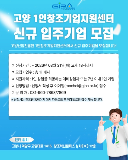 [뉴스앤톡] 고양산업진흥원이 ‘고양 1인 창조기업 지원센터’ 2026년 1차 신규 입주기업을 모집한다.