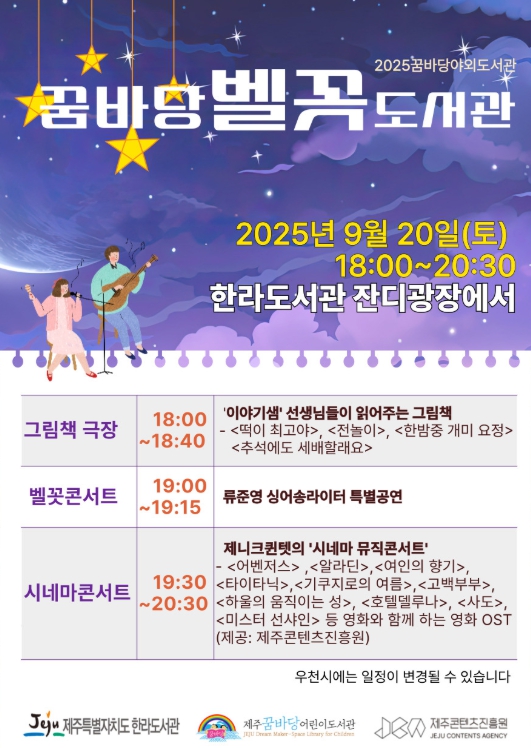 [뉴스앤톡] 제주특별자치도 한라도서관(관장 양애옥)과 제주꿈바당어린이도서관은 20일 오후 6시부터 8시 30분까지 한라도서관 야외잔디마당에서 ‘꿈바당 벨꼿도서관 시네마 콘서트’를 운영한다.