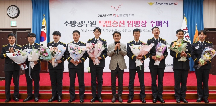 [뉴스앤톡] 강원특별자치도는 12월 3일 도청 신관 대회의실에서 도민의 생명과 안전을 지키는 데 헌신한 우수 소방공무원 8명에 대해 특별승진 임용장 수여식을 개최했다고 밝혔다.