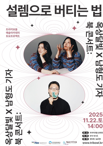 [뉴스앤톡] (재)인천문화재단이 운영하는 트라이보울에서 오는 11월 22일 오후 2시, '트라이보울 토요프로젝트 ‘옥상달빛×남형도 기자 북 콘서트: 설렘으로 버티는 법’' 이 열린다.