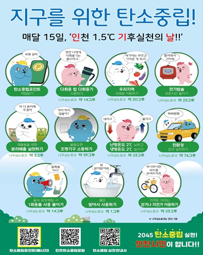 먼저 생활 속 탄소중립 실천문화 조성을 위해 매달 15일을 ‘인천 1.5°C 기후실천의 날(인기날)’로 운영한다. 월별 탄소중립 중점 실천과제를 안내하고 버스정보안내기와 광역버스, 축구장 전광판 등 시민 생활과 밀접한 공간을 활용해 홍보 영상을 송출하며 실천 방법을 알리고 있다.