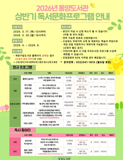 수강 신청 기간은 3월 17일 오전 10시부터 3월 30일 오후 6시까지이며, 계양구립도서관 누리집을 통해 선착순으로 접수한다. 보다 자세한 사항은 누리집 내 독서문화프로그램 안내를 참고하거나, 동양도서관 아동자료실로 문의하면 된다.
