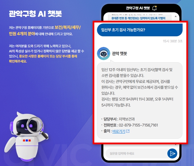 구는 주민 일상과 밀접하고 민원 수요가 높은 ▲임산부, 1인 가구 등 ‘복지’ 분야 ▲대형폐기물 배출, 여권 신청 등 ‘생활 민원’ 분야 ▲재산세 납부, 세목별 안내 등 ‘세무’ 분야 ▲보건증 발급, 의료기관 안내 등 ‘보건’ 분야를 중심으로 챗봇 시범 운영을 시작했다.