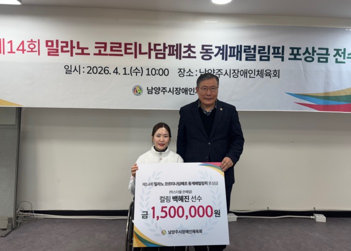 [뉴스앤톡] 남양주시는 지난 1일 남양주시장애인체육회가 제14회 밀라노-코르티나담페초 동계패럴림픽 휠체어컬링 믹스더블 종목 은메달리스트 백혜진 선수에게 포상금을 전달하고 성과를 격려했다고 2일 밝혔다.