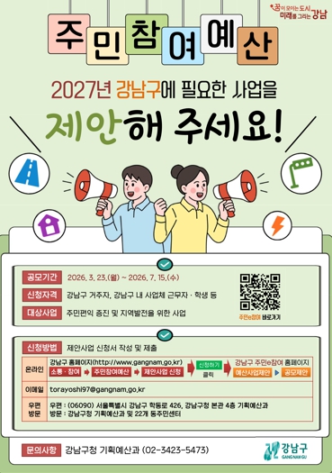 자세한 사항은 강남구청 홈페이지(소통·참여'주민참여예산)에서 확인할 수 있으며, 문의는 기획예산과로 하면 된다.