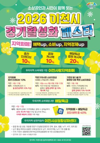 [뉴스앤톡] 이천시는 침체된 지역경제에 활력을 불어넣기 위해 2026년 4월 3일부터 ‘2026 이천시 경기 활성화 페스타’를 본격 추진한다고 밝혔다.