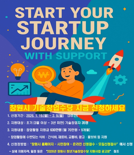 [뉴스앤톡] 창원특례시는 1월 19일부터 2월 9일까지 ‘2026년 청년기술창업수당 지원사업’ 참여자 35명을 모집한다고 밝혔다.