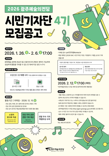[뉴스앤톡] 광주광역시 예술의전당은 전당의 다양한 공연 정보와 문화 소식을 직접 취재하고 공식 온라인 채널을 통해 알릴 ‘2026 광주예술의전당 시민기자단 4기’를 26일부터 2월6일까지 모집한다.