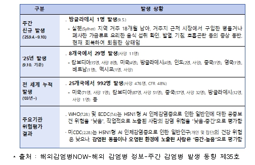 | ▲ 전 세계 H5N1형 조류인플루엔자 인체감염증 발생 현황(’25.9.10.기준) |