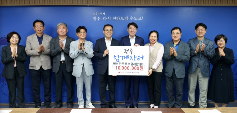바이전주우수업체협의회(회장 전상문)는 16일 전주시장실을 방문해 ‘전주함께장터’ 기부금 1000만 원을 전달했다.