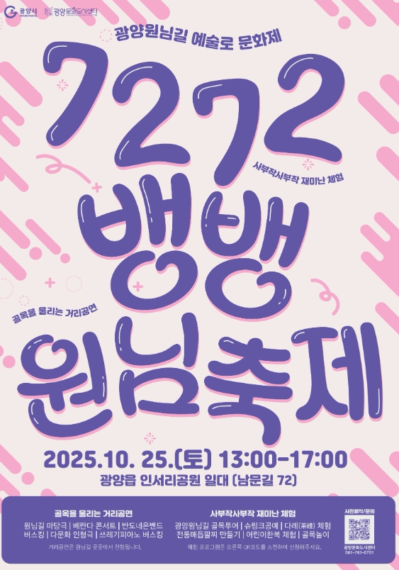 [뉴스앤톡] 광양문화도시센터는 오는 10월 25일 금요일 오후 광양읍 인서리공원 일대에서 광양원님길 브랜드 축제 ‘7272뱅뱅원님축제’를 개최한다고 밝혔다.