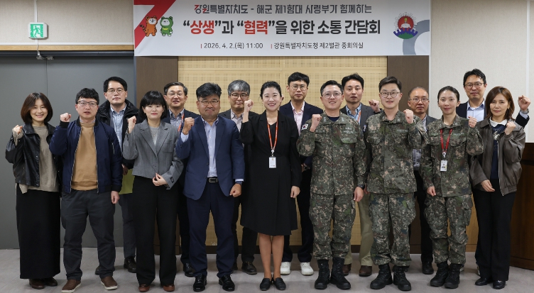 이날 간담회에는 강원특별자치도 및 해군 제1함대사령부 주요 관계자들이 참석한 가운데 ▲군 프로그램의 홍보를 통한 지역 참여 확대 ▲군 장병의 문화 체육 활동 참여를 통한 복지 증진 ▲지역대학과의 협력기반 마련을 통한 청년 유입 확대 ▲도 생활인구 활성화 방안 및 고향사랑기부금 정책 홍보 등을 논의하는 자리를 가졌다.