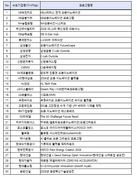 한편, 중기부는 금번 ‘전략과제 해결형’ 외에도, ‘민간 선별·추천형’에서 오픈이노베이션 지원 프로그램 30개를 선정했다. 현대자동차 (제로원), 삼성전자 (C-Lab Outside) 등 오픈이노베이션 역량·실적이 우수한 대기업들이 새롭게 참여했으며, 기업 자체적 오픈이노베이션 프로그램을 통해 선별된 스타트업을 프로그램 운영기업에서 추천시 중기부에서 연계 지원할 예정이다.