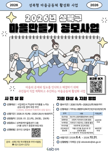 [뉴스앤톡] 서울시 성북구는 마을공동체 활성화를 위해 '2026년 성북구 마을만들기 공모사업'을 진행한다.