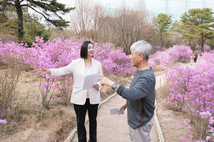 | ▲ 정초립 의원이 오패산 둘레길 일대 ‘질달래 특화정원’ 현장을 점검하고 있다. |
