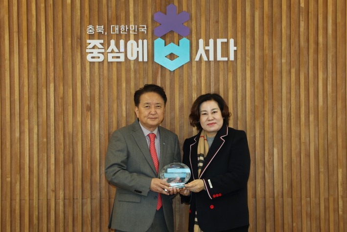 ▲ 명예사회복지사 위촉패 전달식(왼쪽부터 김영환 지사, 정미경 충북사회복지사협회 부회장)