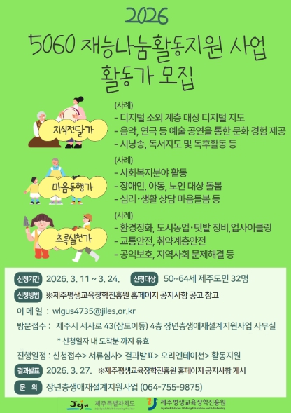 [뉴스앤톡] (재)제주평생교육장학진흥원(원장 진희종)에서는 제주도민 50~64세 대상으로 ‘5060재능나눔 활동가’를 모집한다.