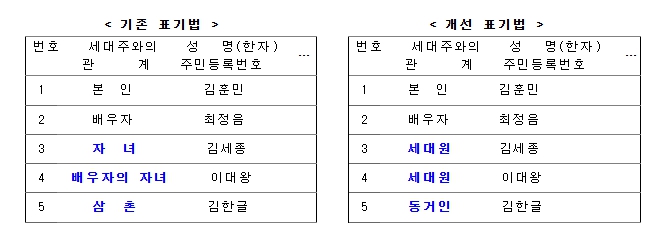 먼저, 재혼가정 등에서의 필요 이상의 개인정보 표기로 인한 사생활 침해를 방지하고자, 필요 최소한의 개인정보만을 나타내도록 주민등록표 등·초본 표기 양식을 개선했다.