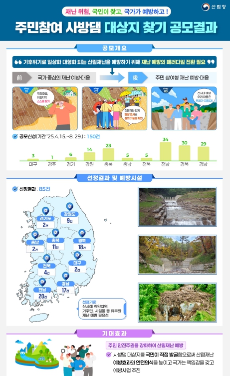 산림청은 지난 4월부터 8월까지 ‘주민 참여 사방댐 대상지 공모’를 추진해 산사태 취약지역, 민가 지역 등 총 150건이 신청됐으며, 관련 전문가의 현장 조사를 통해 내년도 사방사업 대상지로 85건을 최종 선정했다.
