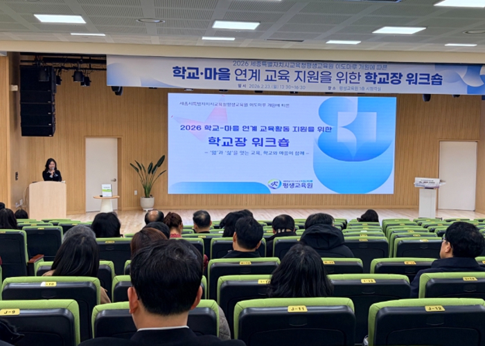 [뉴스앤톡] 세종특별자치시교육청평생교육원은 2월 23일 평생교육원 이도마루에서 세종시 초중고·특수·각종학교 학교장을 대상으로 ‘2026년 학교·마을 연계 교육활동 지원을 위한 교육 협력 워크숍’을 개최했다.