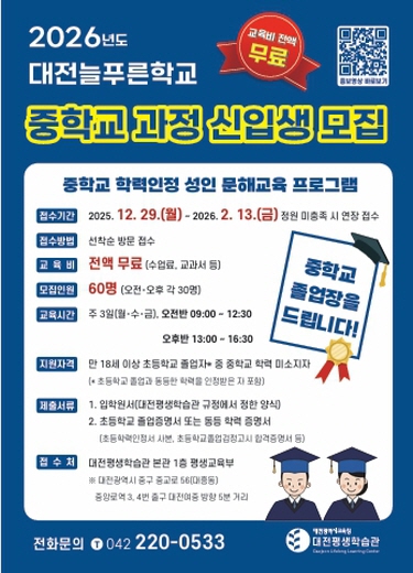 [뉴스앤톡] 대전평생학습관은 2026년 2월 13일까지 2026년 대전늘푸른학교 중학교 학력인정 과정 신입생을 모집한다고 밝혔다.