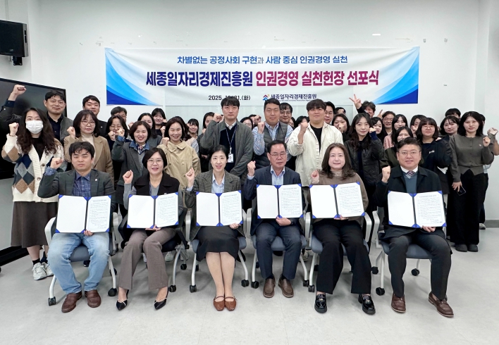 [뉴스앤톡] 세종일자리경제진흥원(원장 이홍준)은 21일 본원 2층 교육실에서 ‘인권경영 실천헌장 선포식’을 열고 모든 임직원이 인권을 경영의 핵심 가치로 삼아 실천해 나갈 것을 다짐했다.