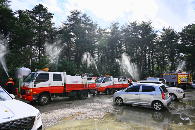 훈련은 가을철 단풍 관광객이 집중되는 리조트 지역에서 발생한 화재가 인근 산림으로 확산하며 대형산불로 이어지는 복합 재난 상황을 가정해 △현장 초기대응 △관광객 대피 유도 △화재 진압 및 산불 진화 △인명구조 및 응급처치 △수습 및 복구 지원 등 재난 대응 전 과정을 실전처럼 전개했다.