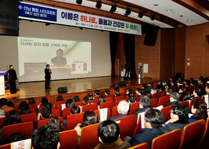 [뉴스앤톡] 광주광역시는 2일 빛고을노인건강타운에서 ‘광주전남 통합 복지·보건·의료 분야 시민공청회’를 개최, 광주전남 통합으로 광주가 시작한 통합돌봄 등을 더 두텁게 보장할 수 있는 방안 등을 논의했다.