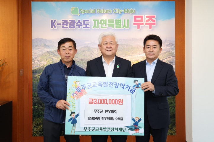 [뉴스앤톡] 무주군 한우협회 회원들이 지난 1일 무주군교육발전장학재단(이사장 무주군수 황인홍)에 장학금 3백만 원을 기탁했다.