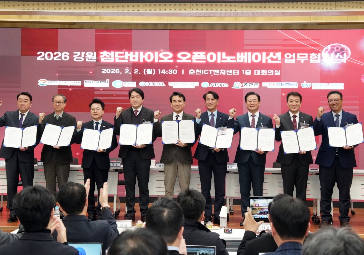 [뉴스앤톡] 홍천군은 2월 2일, 강원특별자치도, 춘천시와 함께 춘천 ICT벤처 센터에서 「강원 첨단 바이오 오픈 이노베이션 프로그램」 업무협약식과 사업설명회를 개최하고, 올해부터 사업을 본격 확대 추진한다고 밝혔다.