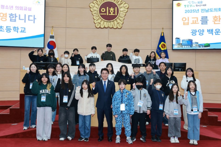 [뉴스앤톡] 전라남도의회 김태균 의장(더불어민주당, 광양3)은 지난 20일, 전라남도의회 본회의장에서 열린 ‘2025년 제24회 청소년 의회교실’에 참석해 광양 백운초등학교 학생들과 공감의 시간을 가졌다.