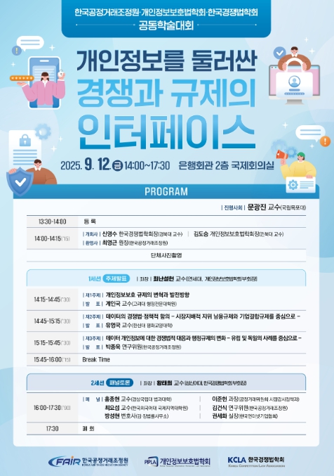 [뉴스앤톡] 공정거래위원회 한국공정거래조정원은 한국경쟁법학회, 개인정보보호법학회와 함께 ‘개인정보를 둘러싼 경쟁과 규제의 인터페이스’를 주제로 공동 학술대회를 개최했다.