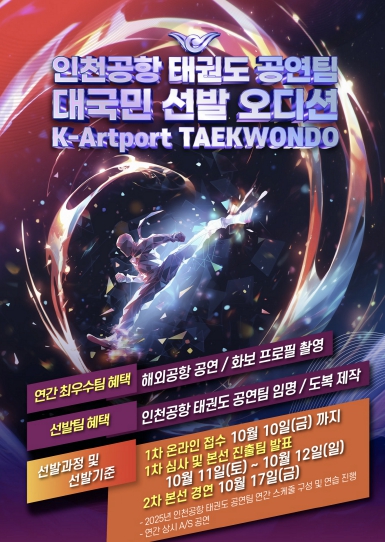 [뉴스앤톡] 인천국제공항공사는 인천공항에서 진행되는 태권도 상설공연인 ‘2025-2026 인천공항 태권도 상설공연’에 참여할 태권도 전문 공연팀을 공개 모집한다고 28일 밝혔다.
