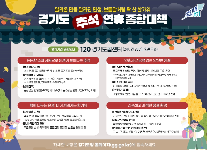 [뉴스앤톡] 경기도는 도민 모두가 안전하고 넉넉한 추석을 보낼 수 있도록 10월 3일부터 10월 9일까지 7일간 ‘추석 연휴 종합대책’을 추진한다. 도는 종합상황실을 24시간 운영하고 비상근무 체계를 가동해 연휴 중 발생할 수 있는 불편과 사고에 신속 대응할 방침이다.