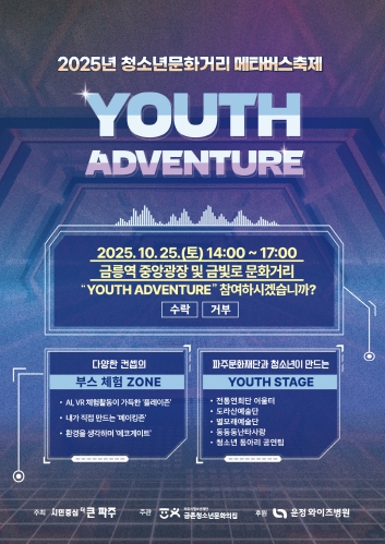 [뉴스앤톡] (재)파주시청소년재단 금촌청소년문화의집은 오는 2025년 10월 25일 토요일 금릉역 중앙광 및 금빛로 문화거리 일대에서 2025년 청소년문화거리메타버스축제 ‘YOUTH ADVENTURE’를 개최한다고 밝혔다.