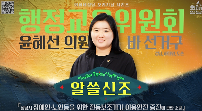 이번에 소개하는 조례는 윤혜선 의원 등 19명이 공동 발의한 '성남시 장애인ㆍ노인 등을 위한 전동보조기기 이용 안전 증진에 관한 조례'이다. 이 조례는 성남시에 거주하는 장애인, 노인 등의 전동보조기기 이용 안전 증진에 필요한 사항을 규정하여 이들의 이동권을 보장하고 사회활동 참여 확대에 이바지하는 것을 목적으로 한다. 이번 조례 제정으로 이동 약자를 위한 안전망이 강화되고, 성남시의 포용적 도시환경이 확산될 것으로 기대된다. 이 조례는 2025년 7월 1일부터 시행 중이다.