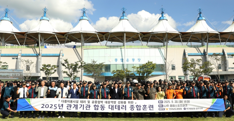 이번 훈련은 국내외 다수의 관람객 및 운동선수들이 방문하는 나주종합스포츠파크와 같은 다중이용시설에서 최근 빈발하고 있는 폭발물 공중협박 및 112거짓신고, 인질테러, 드론에 의한 화생방 공격 등 실제 발생 가능한 복합 상황을 가정하여 훈련을 진행했다.