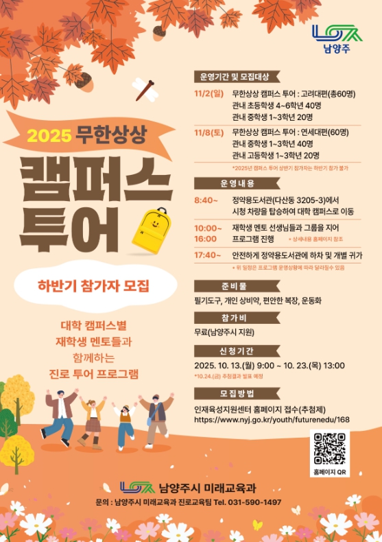 [뉴스앤톡] 남양주시는 10월 13일부터 10월 23일까지 관내 초등학교 4학년부터 고등학교 3학년을 대상으로 ‘무한상상 캠퍼스 투어’ 참가자를 모집한다.