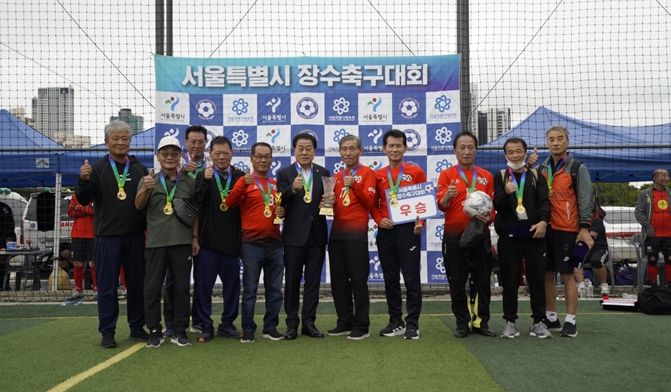| ▲ 지난 10월 11일과 12일, 성동구 살곶이체육공원 축구장에서 열린 ‘서울시 7080 장수축구대회’에 참석한 김용호 서울시의원(왼쪽 여섯 번째)이 70대B조에서 우승한 용산구 70대 장수축구단에게 우승컵과 트로피를 시상한 후 기념촬영을 하고 있다. |