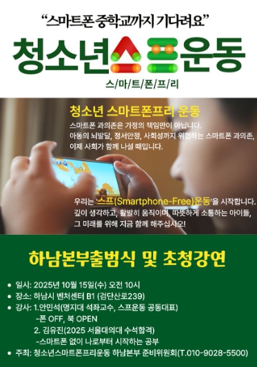 [뉴스앤톡] 15일 오전 10시, 하남시 벤처센터에서 ‘청소년 스마트폰 프리 운동(Smartphone-Free)’ 하남본부 출범식을 갖는다.