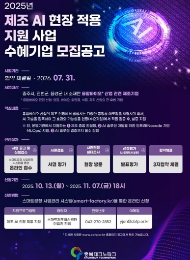 기타 ‘제조 AI 현장 적용 지원사업’에 대한 자세한 사항은 충북도청 홈페이지에서 확인할 수 있다.