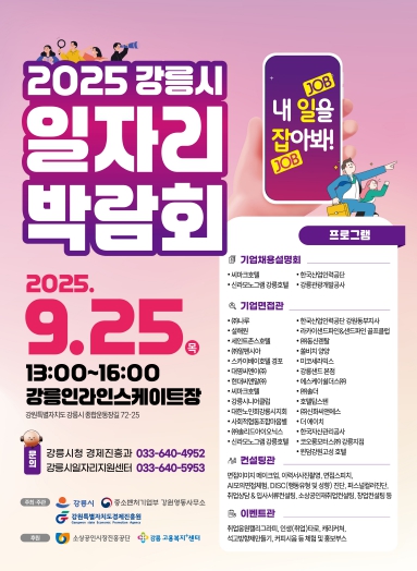 [뉴스앤톡] 강릉시는 중소벤처기업부 강원영동사무소, 강원특별자치도경제진흥원과 함께하는 '2025 강릉시 일자리 박람회'를 오는 9월 25일 오후 1시부터 4시까지 강릉인라인스케이트장에서 개최한다.