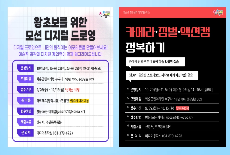 [뉴스앤톡] 화순군(군수 구복규)은 오는 10월 15일과 20일 화순군 청년센터(청춘들락) 미디어공작소에서 영상 제작과 디지털드로잉 분야의 창의적 미디어 교육 프로그램을 시작한다고 밝혔다.