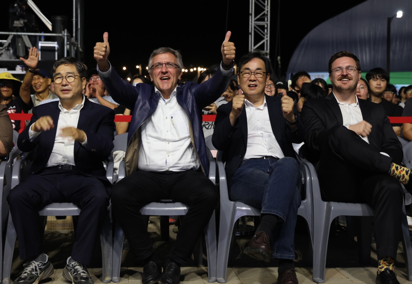 | ▲ 강상구 나주시 부시장(왼쪽)과 토마스 그리스 교수(왼쪽 두 번째)가 영산강정원에서 케이팝 콘서트를 관람하고 있다. |