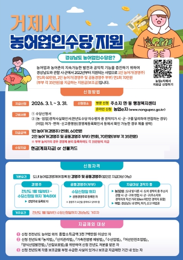 [뉴스앤톡] 거제시는 농어업·농어촌의 공익적 기능을 유지·증진하고 농어업인의 소득 안정을 지원하기 위해 ‘2026년 농어업인수당’ 신청을 3월 1일부터 3월 31일까지 접수하고 있다.