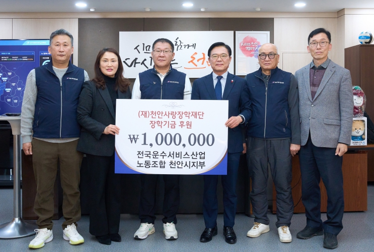 [뉴스앤톡] 천안시는 30일 전국운수서비스산업노동조합 천안시지부가 미래 인재 양성을 위해 천안사랑장학재단에 2031년까지 매년 장학기금 100만 원을 기탁하기로 약속했다고 밝혔다.