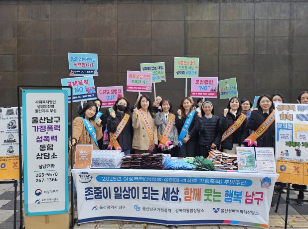 [뉴스앤톡] 울산 남구는 ‘2025년 여성폭력 추방주간’을 맞아 27일 삼산 디자인거리 일대에서 울산성매매피해상담소와 울산남구가정폭력·성폭력통합상담소가 함께 ‘2025년 여성폭력 추방주간 캠페인’을 실시했다.